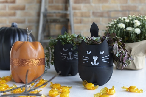 Make a black cat and a candy jar with plastic bottles